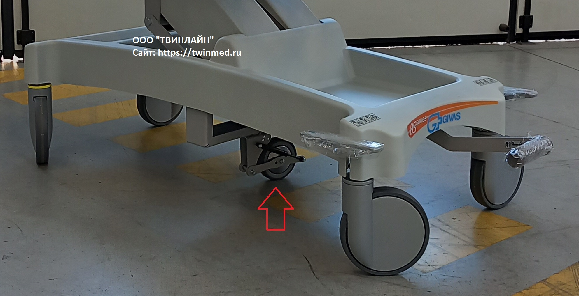 В стандартной комплектации на каталку для перевозки лежачих больных устанавливаются колеса диаметром 200 мм, с системой центральной блокировки, фиксацией направления одного переднего колеса и одним антистатическим колесом.