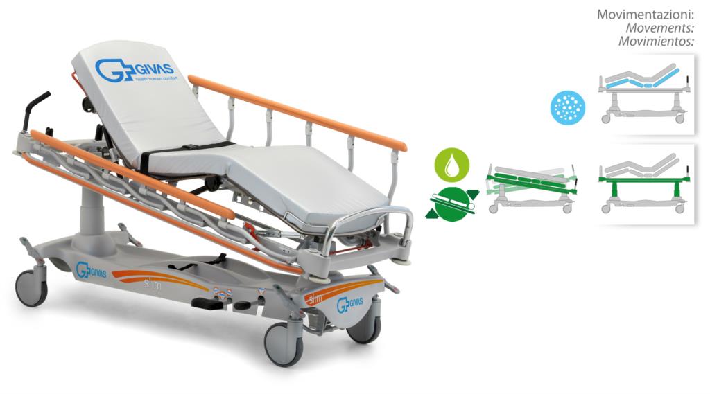 Каталка медицинская для перевозки пациентов гидравлическая, 4-х секционная, с рентгенопроницаемым ложем, модель BT1405, производства фирмы "GIVAS s.r.l." Италия